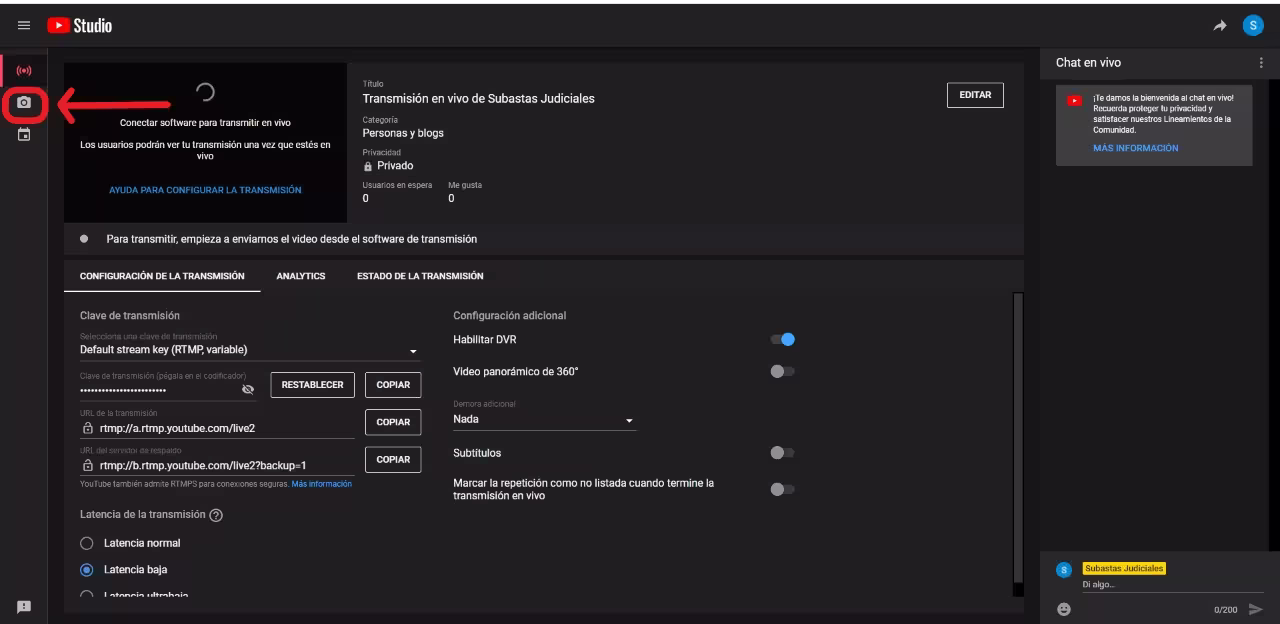 En “Clave de retransmisión” colocar la clave de retransmisión copiada en YouTube Studio.