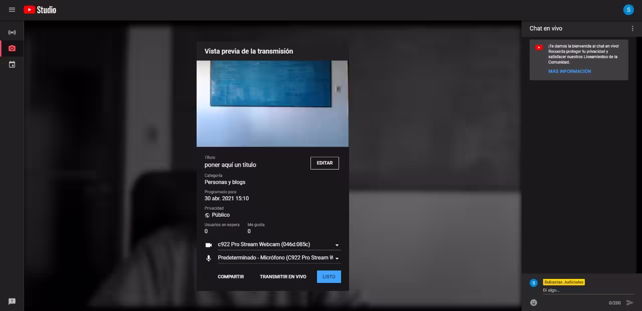 Ir a la página del bien objeto de la transmisión y hacer clic en el botón “Configurar transmisión en vivo”.