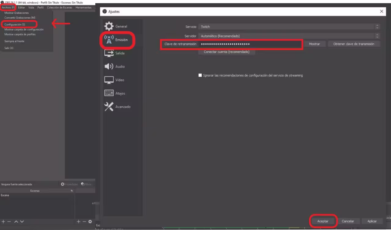 Abrir OBS, hacer clic en “Archivo” -> “Configuración”, en el menú de la izquierda, seleccionar “Emisión” y colocar la clave de retransmisión del paso anterior.